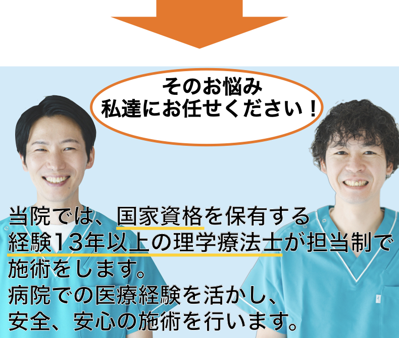 医療機関で医師と共に経験を積んだ"体の専門家"の理学療法士が対応。医学的な知識と様々な痛みや不調の方を診てきた経験があるので安心して体を任せられます。施術だけでなく改善と予防の為のアドバイスも受けられます。整形外科クリニックと提携もしているので何でも相談ができます。
